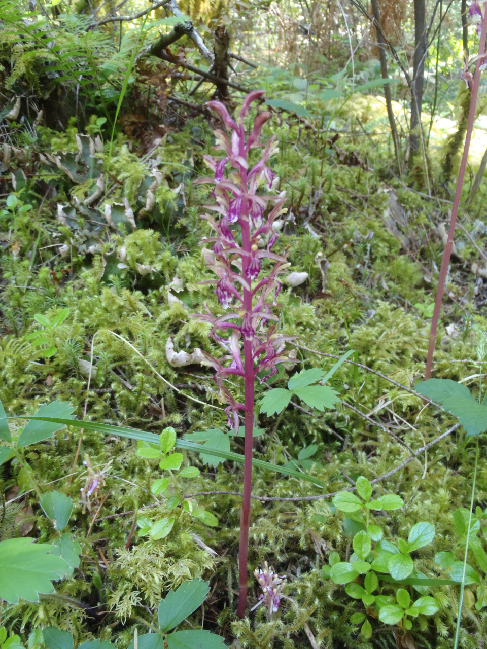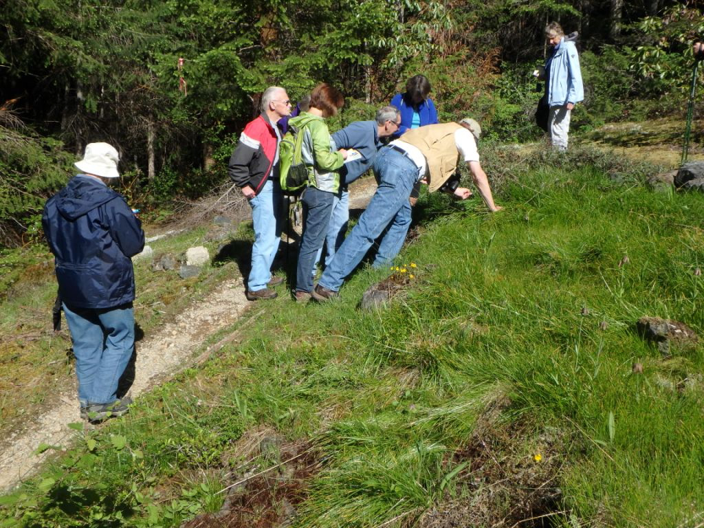 Along the sunnier edges of the forest we saw Pacific dogwood and Saskatoon berry in bloom. Sally spotted some striped coralroot as well. Death Camas were just beginning to flower in some of the grassy openings, while the Monkey flowers and chocolate lilies were in full bloom. Nodding onions provided a culinary treat.