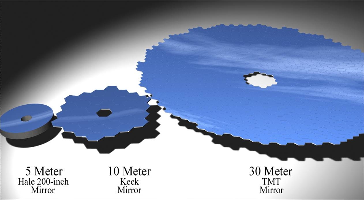 The are limits to how big a piece of glass you can polish into a lens. On the left is the 200 inch Hale Telescope from Palomar Observatory. The 10 m Keck is currently the world’s largest. The solution to larger telescopes is to create multi-faceted ones, like an insect’s eye. The one on the right is the one we’re building…
