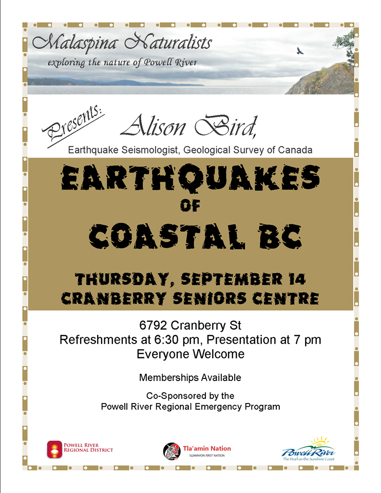 Alison Bird works as Earthquake Seismologist for Natural Resources Canada, and is based in Saanich.  Our club, in partnership with the Powell River Regional Emergency Program (PRREP), invited her to come talk to us about her area of expertise – earthquakes – and she graciously obliged.